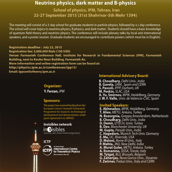 IPM school and conference on Particle Physics (IPP15): Neutrino physics, dark matter and B-physics. 22-27 September 2015 (IPM, Tehran, Iran)