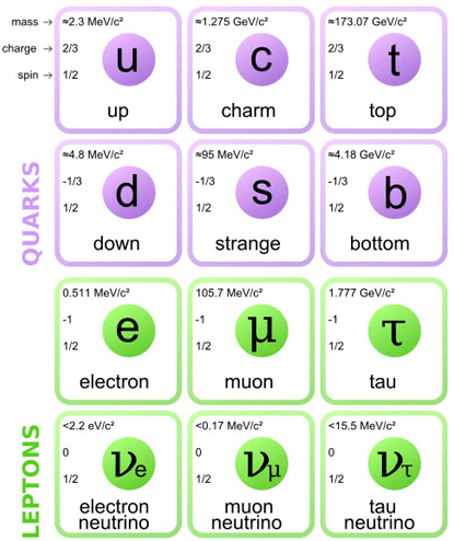 For example, one of the most important and obscure facts in our present knowledge of the particle's world is that all the basic constituents of matter come in three different types, called flavors. We have found three positively charged quarks, called up (u), charm (c) and top (t), three negatively charged ones, called down (d), strange (s) and bottom (b) and, again, three copies of the electron: itself (e), the muon (μ) and the tau (τ). Indeed, we also have three types of neutrino: a νe, which is always produced together with an electron, a νμ and a ντ produced with the μ and the τ respectively. The three flavor families appear ordered hierarchically: the mass of the top quark is about 100 times bigger than that of the charm, which in turn is some 1000 times heavier than the top. Similar patterns exist also among the triplets (d, s, b) and (e, μ, τ).
